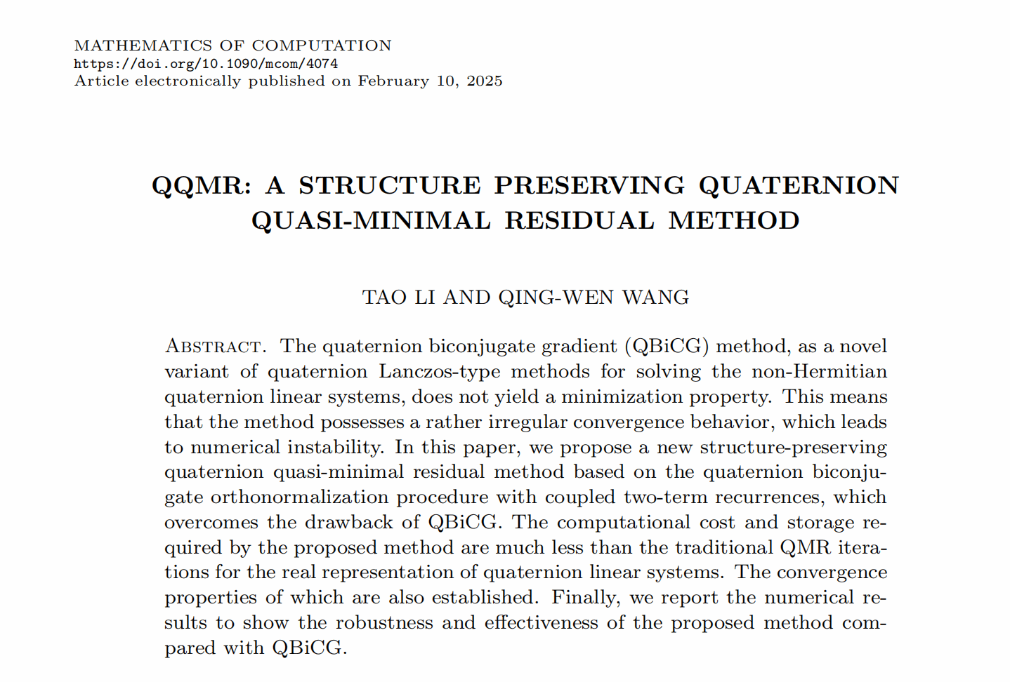 近日,美国数学学会期刊《Mathematics of Computation》在线发表了海南大学李涛博士(第一作者)和王卿文教授的最新研究成果“QQMR: A structure preserving quaternion quasi-minimal residual method”。《Mathematics of Computation》是国际上计算数学领域的顶级期刊,由美国数学学会出版,创刊于1943年,专注于数值分析、计算方法和数学应用等领域的高质量研究。该期刊在学术界享有很高的声誉,发表的文章通常具有重要的理论或应用价值。在中国数学会推荐的数学期刊分类简表中被列为T1类刊物,在中科院分区中也是1区Top期刊。海南大学为此成果的第一完成单位,通讯作者为上海大学王卿文教授。