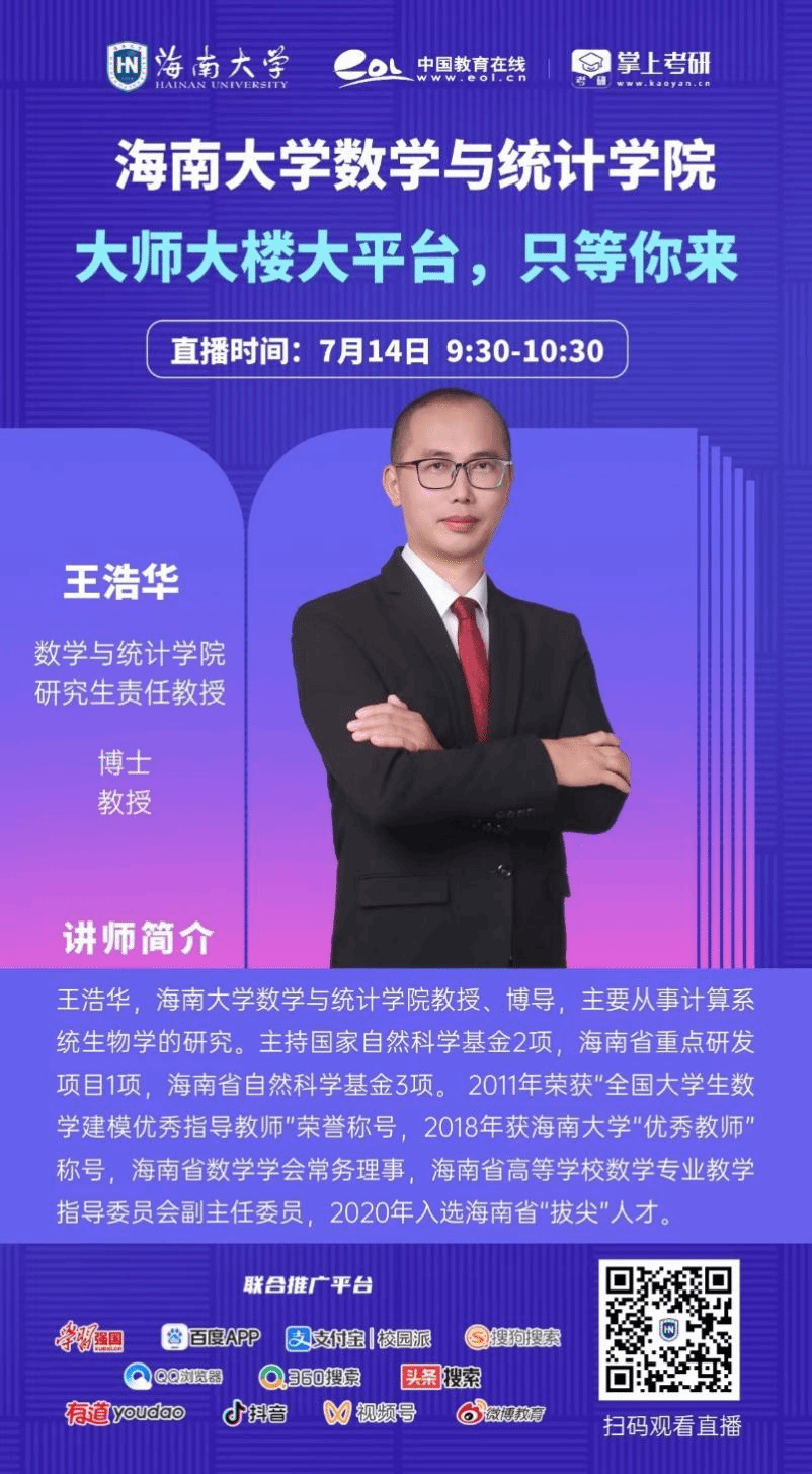 我院教授、博导王浩华老师将对yl88858永利集团研究生情况进行直播介绍,欢迎各位学子、家长和教师在直播时间内扫描海报上二维码观看直播和互动。