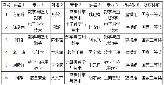 2023年度“高教社杯”全国大学生数学建模竞赛成绩已经公布,海南大学共斩获59个奖项,其中,获国家一等奖1项,国奖二等奖5项,省一等奖9项,省二等奖21项,省三等奖23项。2023共有来自全国33个省/市/自治区/特别行政区以及美国、澳大利亚、马来西亚等国家/地区的1685所院校或校区、59611队(本科组54158队、专科组5453队)、近18万名大学生报名参加本项竞赛,创历年参赛人数新纪录。今年共评选出1828队获全国奖,其中本科一等奖299队、二等奖1200队,分别占本科组参赛总队数的0.55%和2.22%。获得国奖的队伍名单如下: