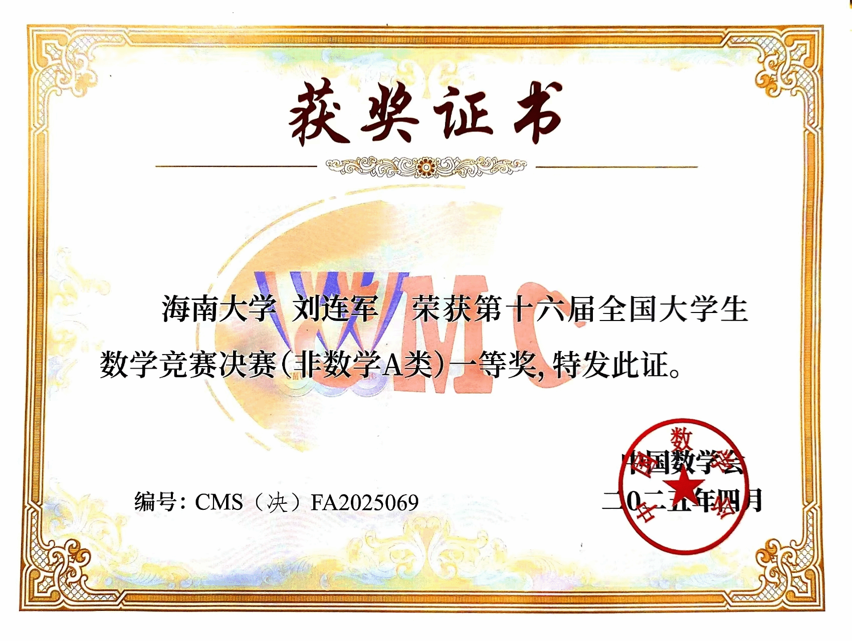 4月12日,第十六届全国大学生数学竞赛决赛在浙江师范大学举行。我校2022级数学与应用数学专业基地班学生项政超荣获数学类高年级组一等奖,2023级人工智能专业刘连军荣获非数学专业A类一等奖,实现了海南赛区在该项赛事上新的历史性突破。此外,2023级数学与应用数学专业基地班周健翔和2023级生物医学工程专业徐志豪分别获得了数学类和非数学类的三等奖。
